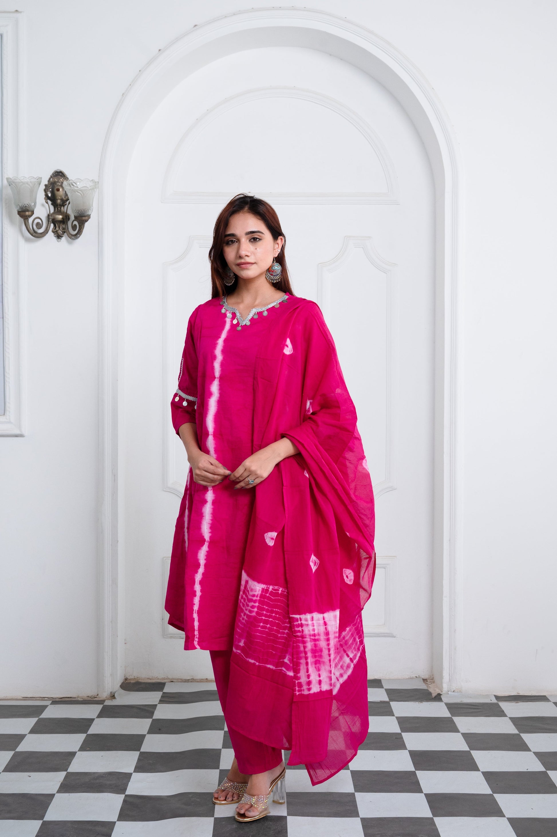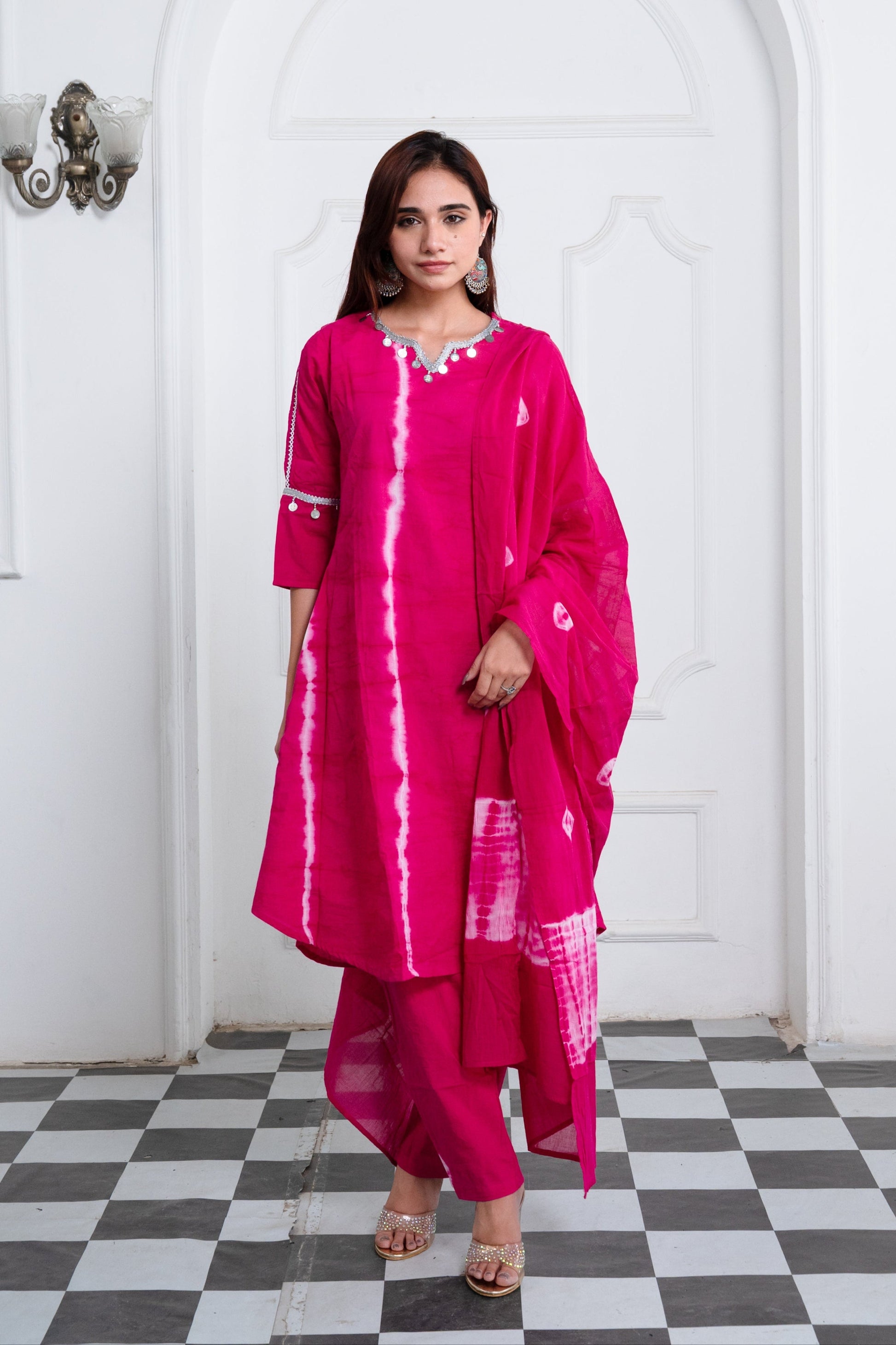 Magenta Rani Pink Shibori Tie-Dye Cotton Suit with Silver Lace Trim