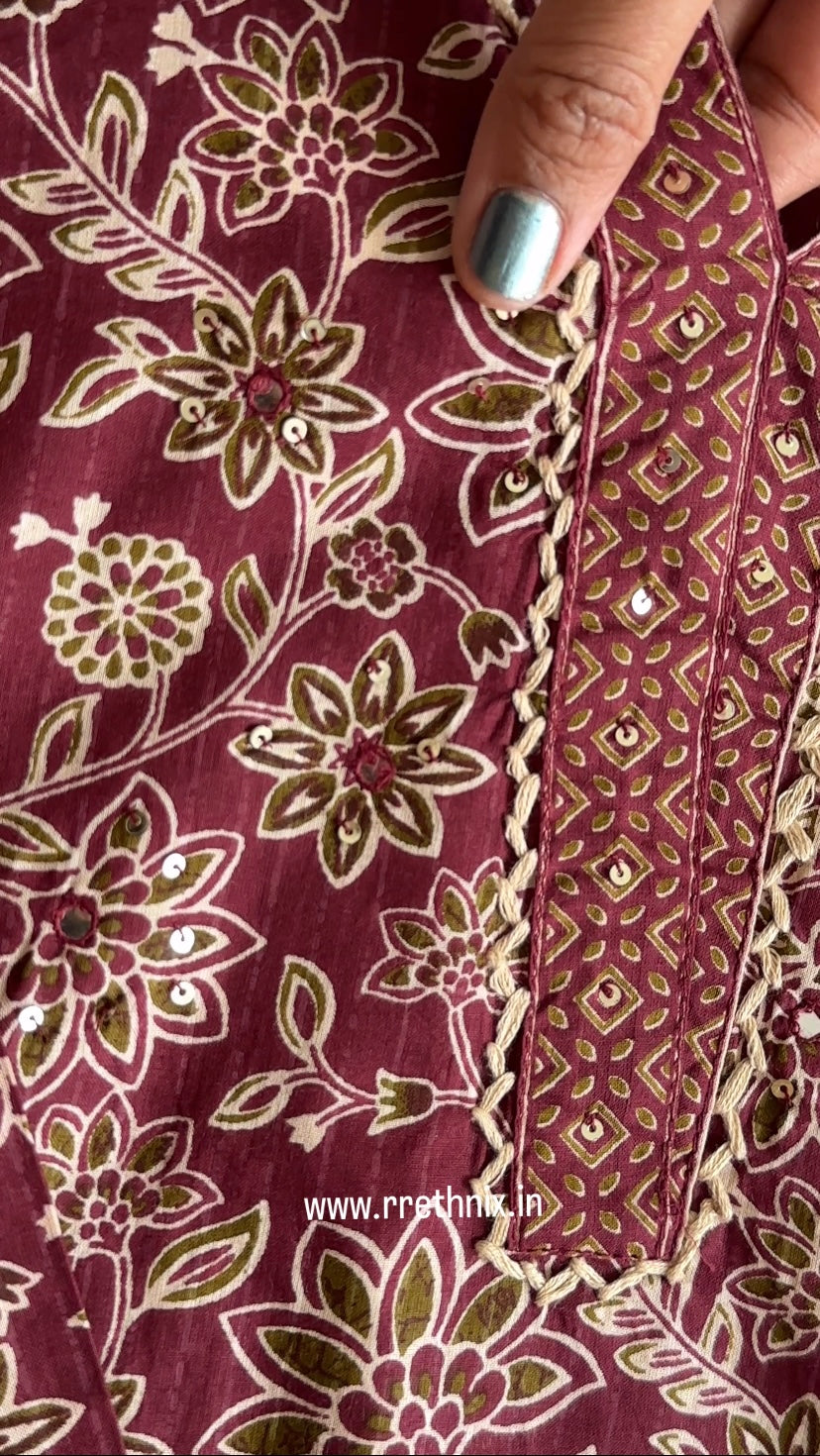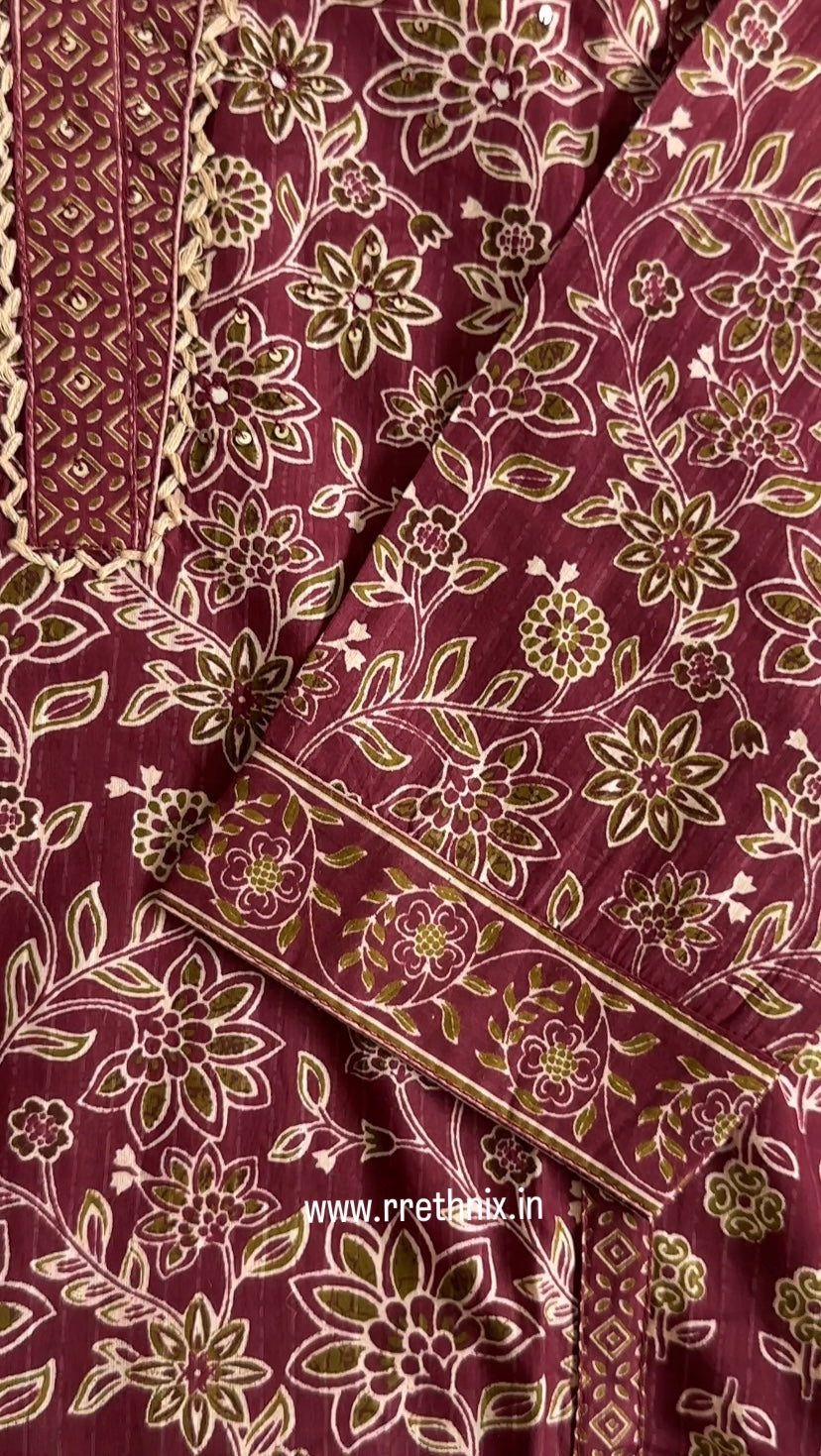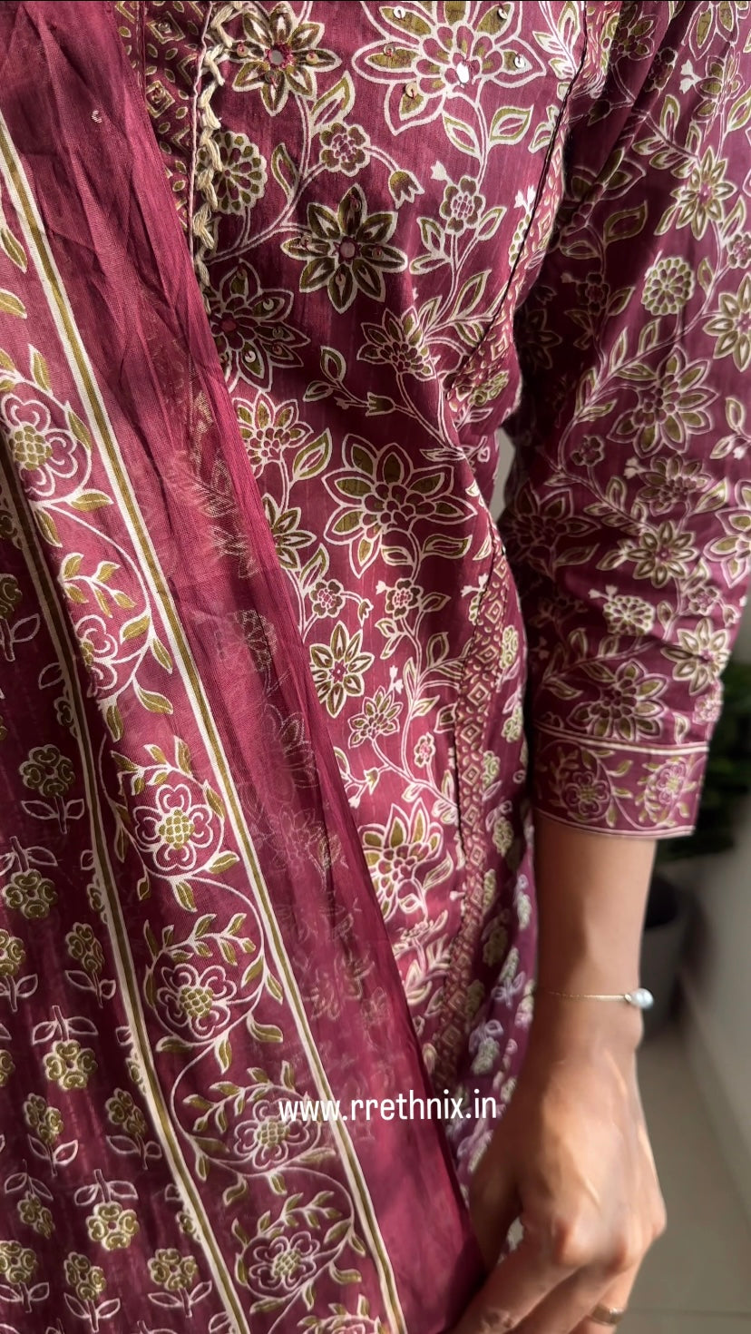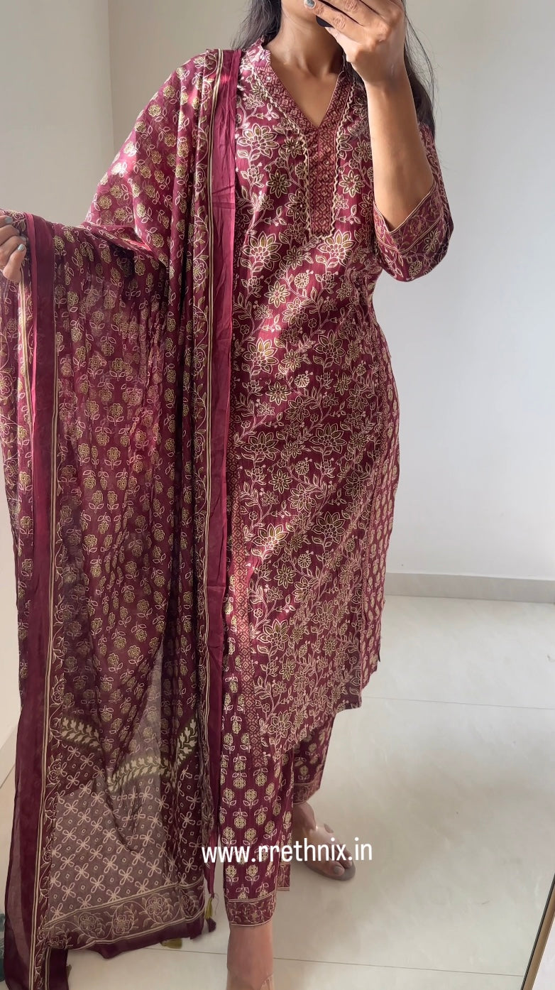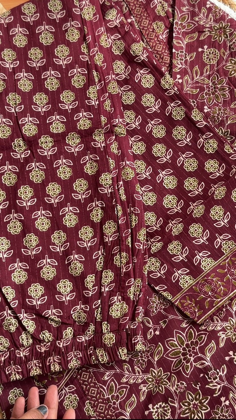 Maroon Hand Block Print Cotton Suit Set with Dupatta &Pant,Casual Wear