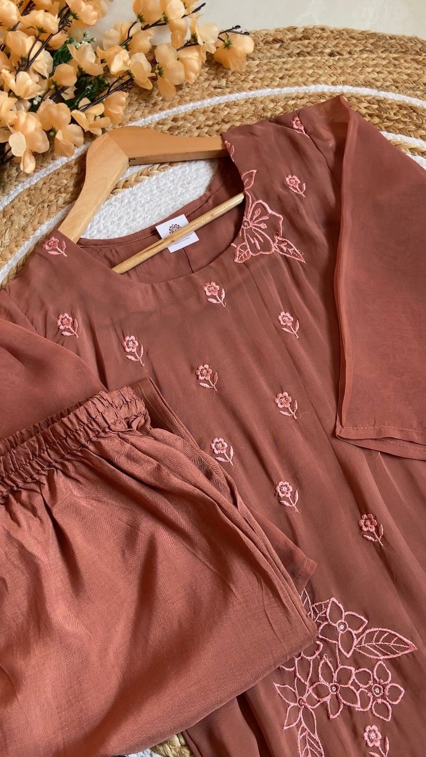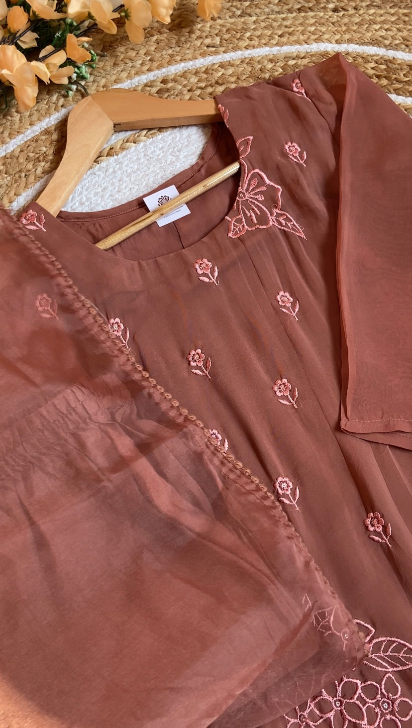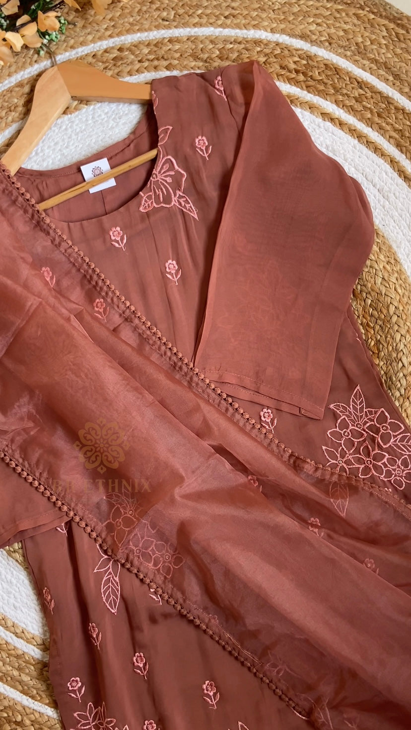 Rustic Terracotta Brown Organza Embroidered Suit Set