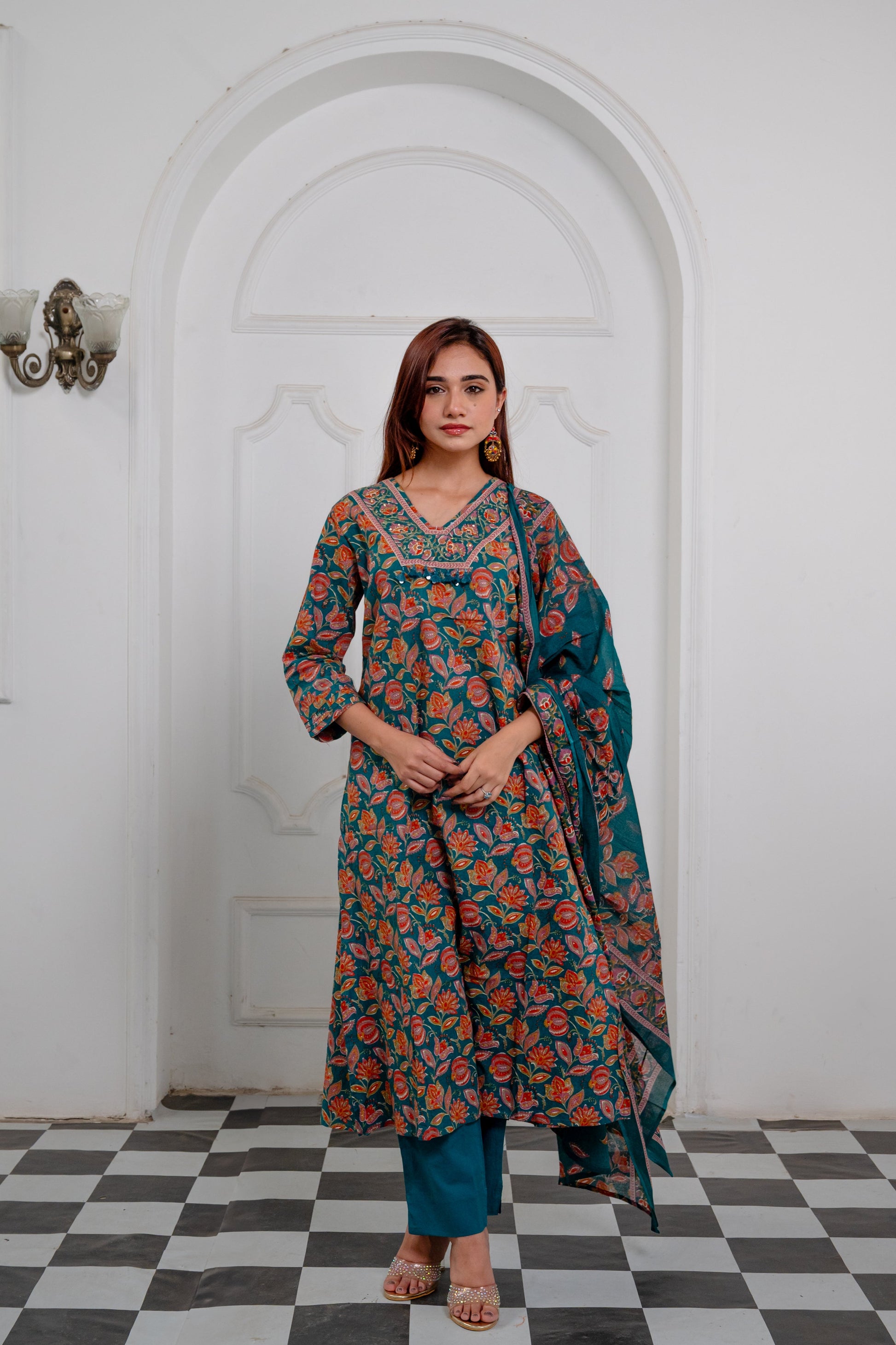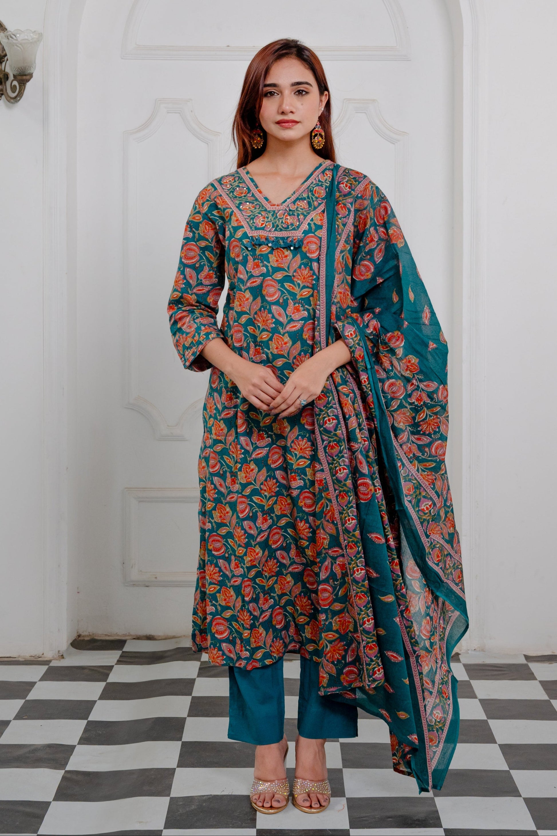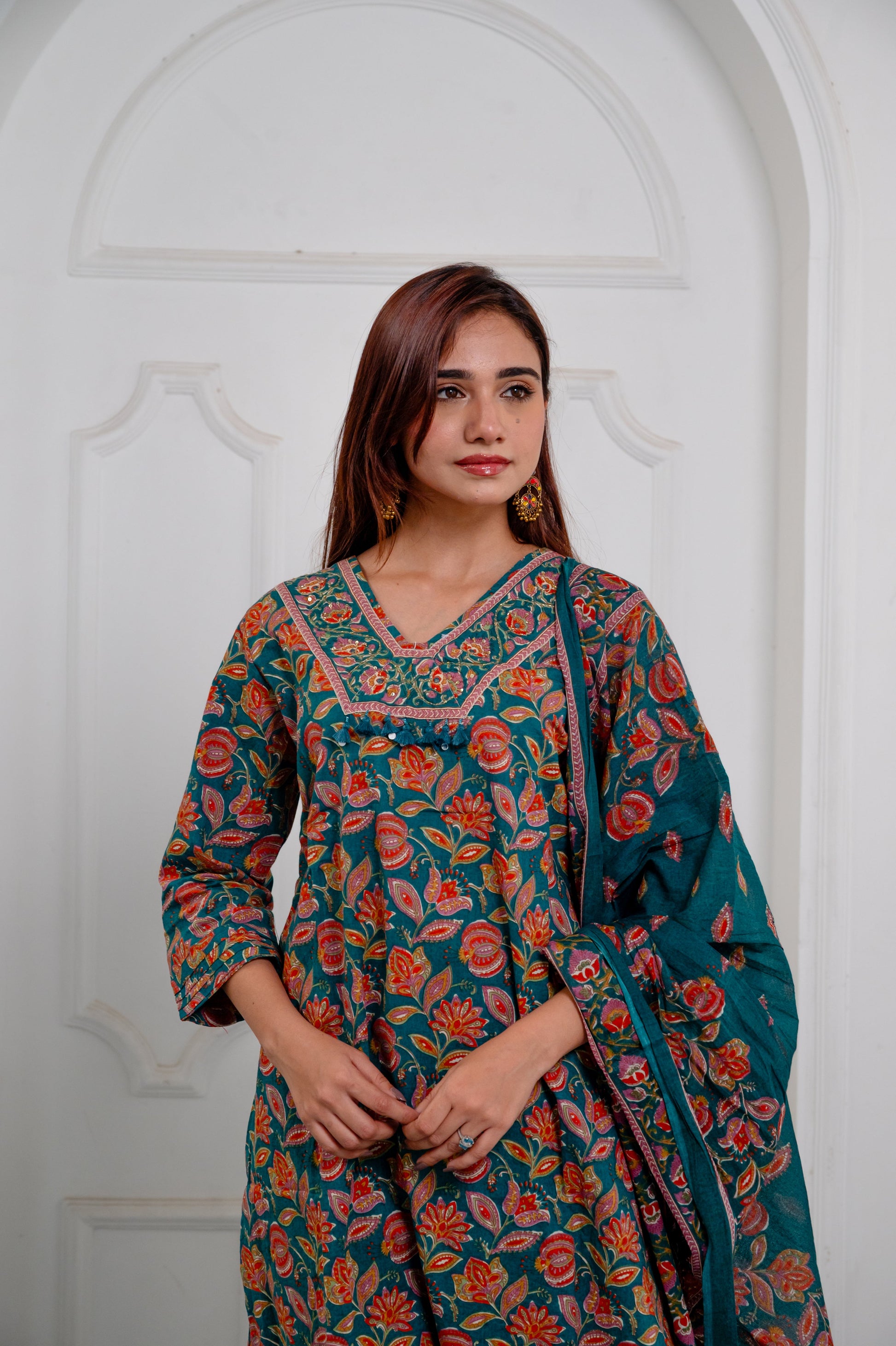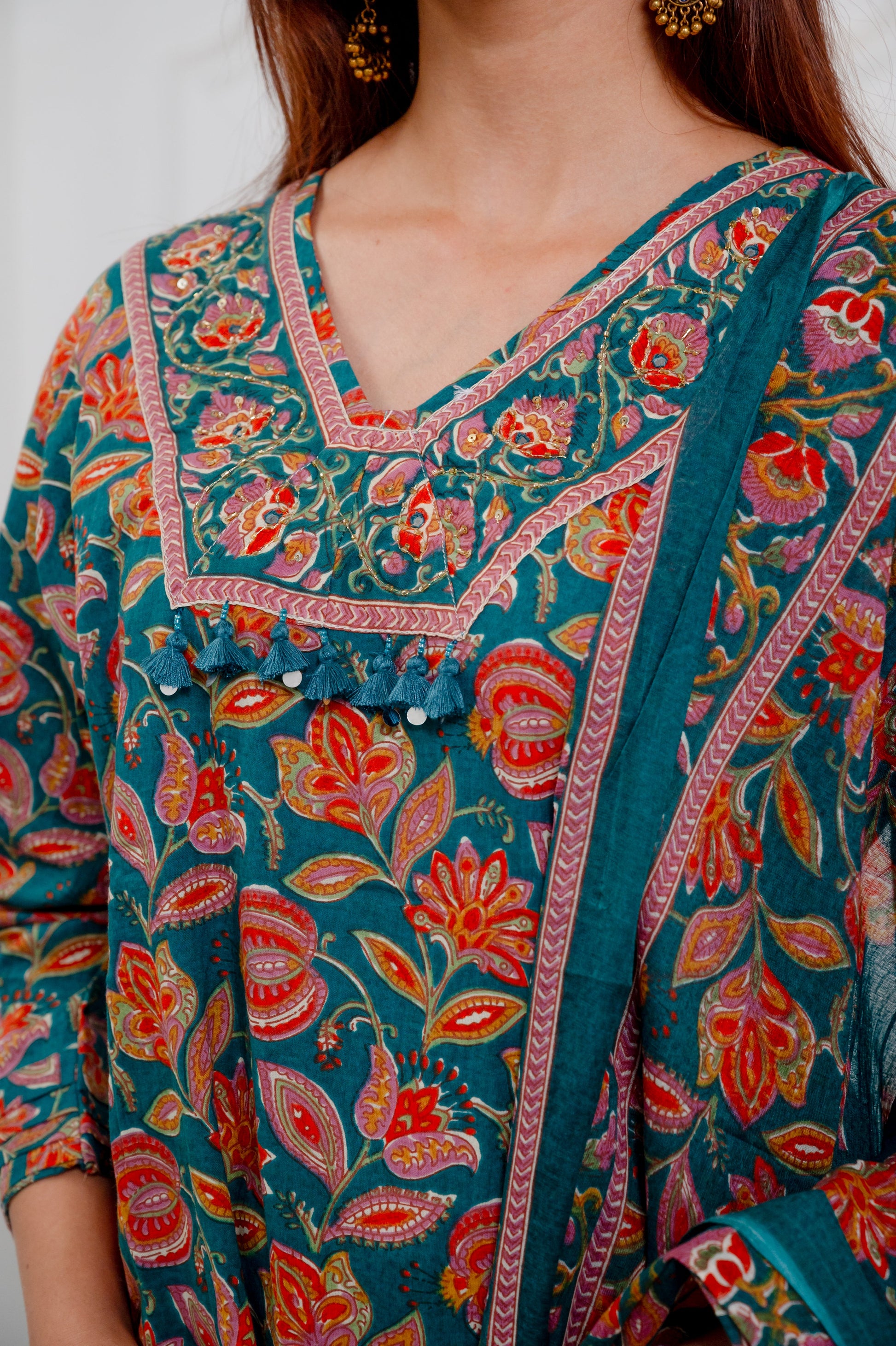 Teal Green Cotton Suit Set with Rust Floral Print & Sequin Dupatta