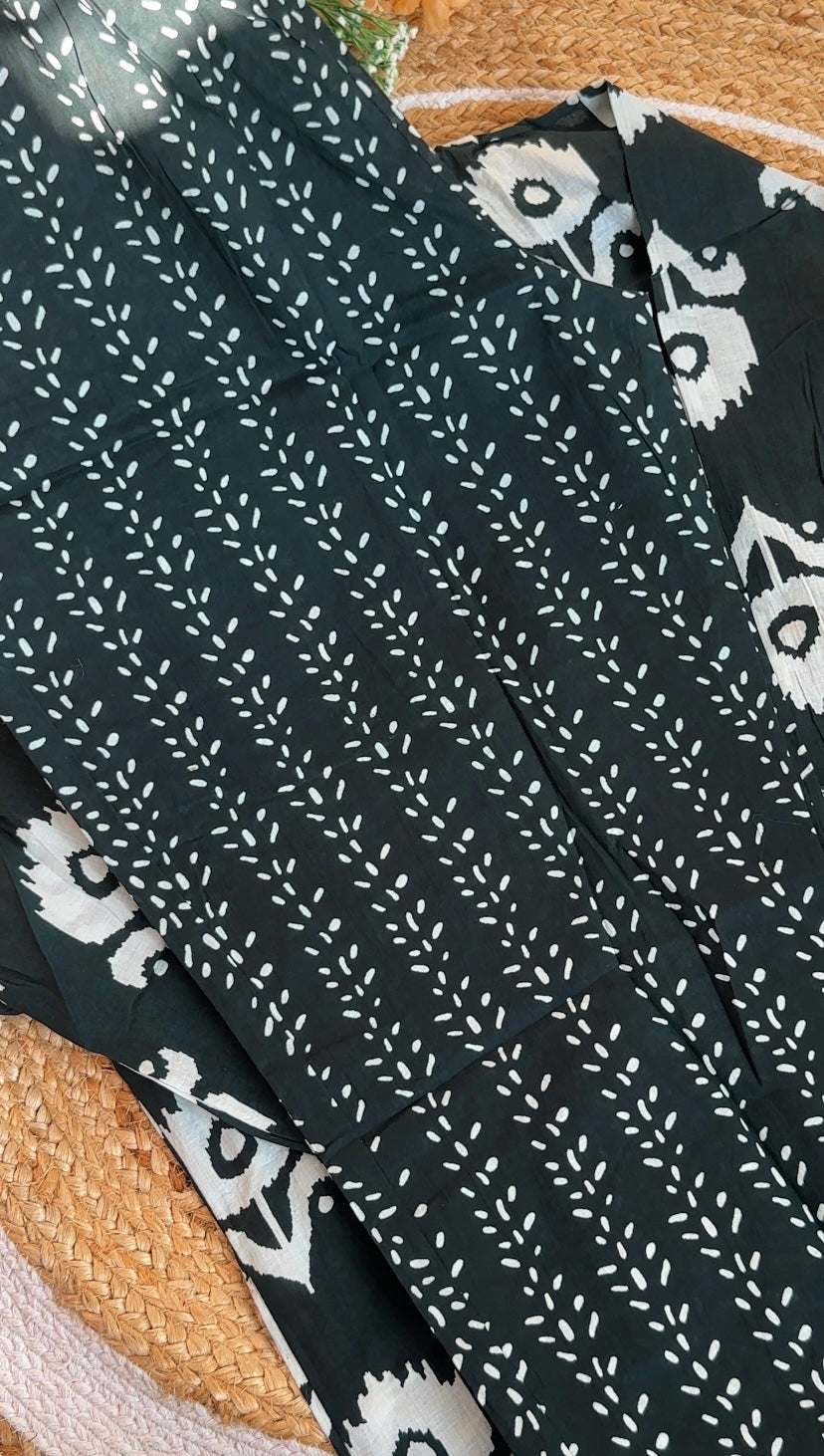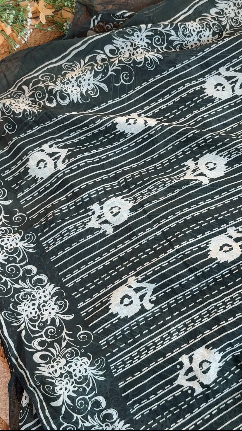 Embrace the royal elegance of this stunning Dark Green Ikat Print Cotton Salwar suit. The deep, jewel-toned green is universally flattering and perfectly complemented by intricate detailing, making it a must-have in your collection of women's ethnic wear.