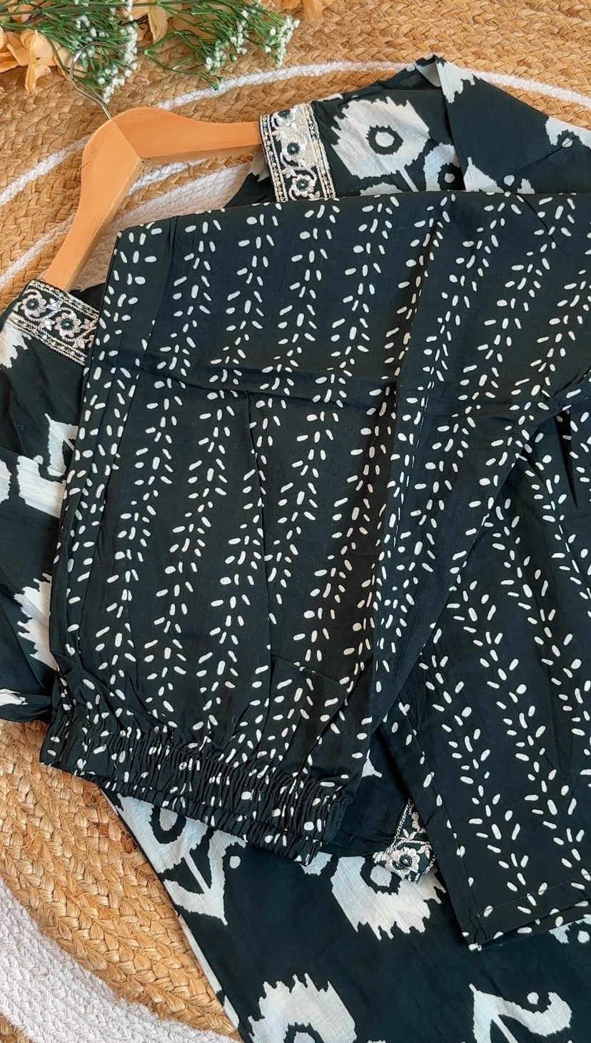 Dark Green Ikat Print Cotton Kurta Set with Embroidered Neck | Women's Casual Wear
