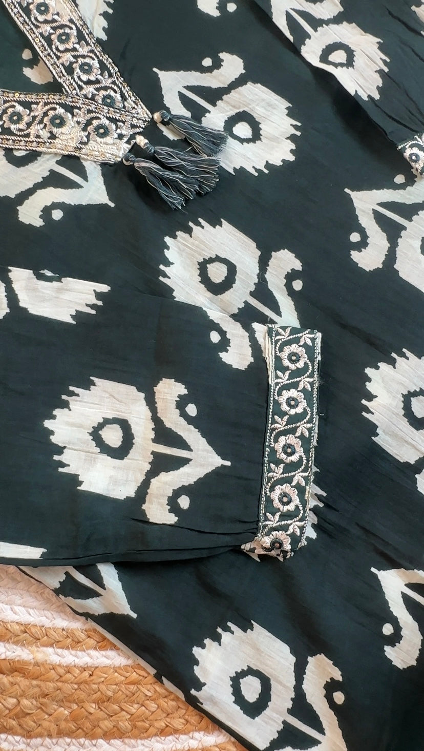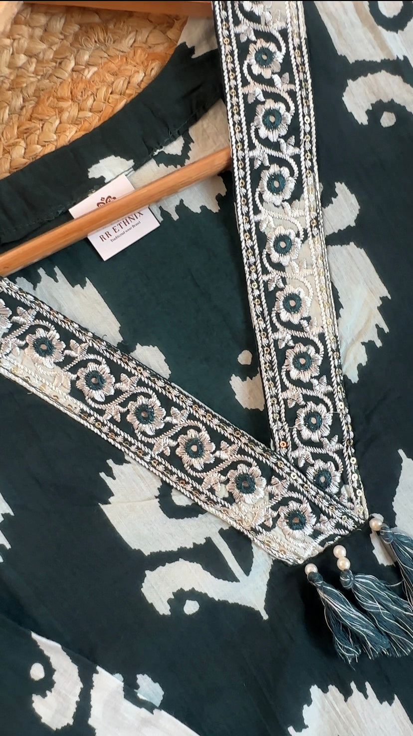 Features an all-over classic Ikat-inspired floral print in off-white on a rich dark Green base. The V-neckline is beautifully adorned with intricate Gota Patti and silver zari embroidery, lending a festive touch. The 3/4th sleeves are finished with a matching embellished border. The flowing straight-cut silhouette offers a comfortable and elegant fit for plus size and curvy women.