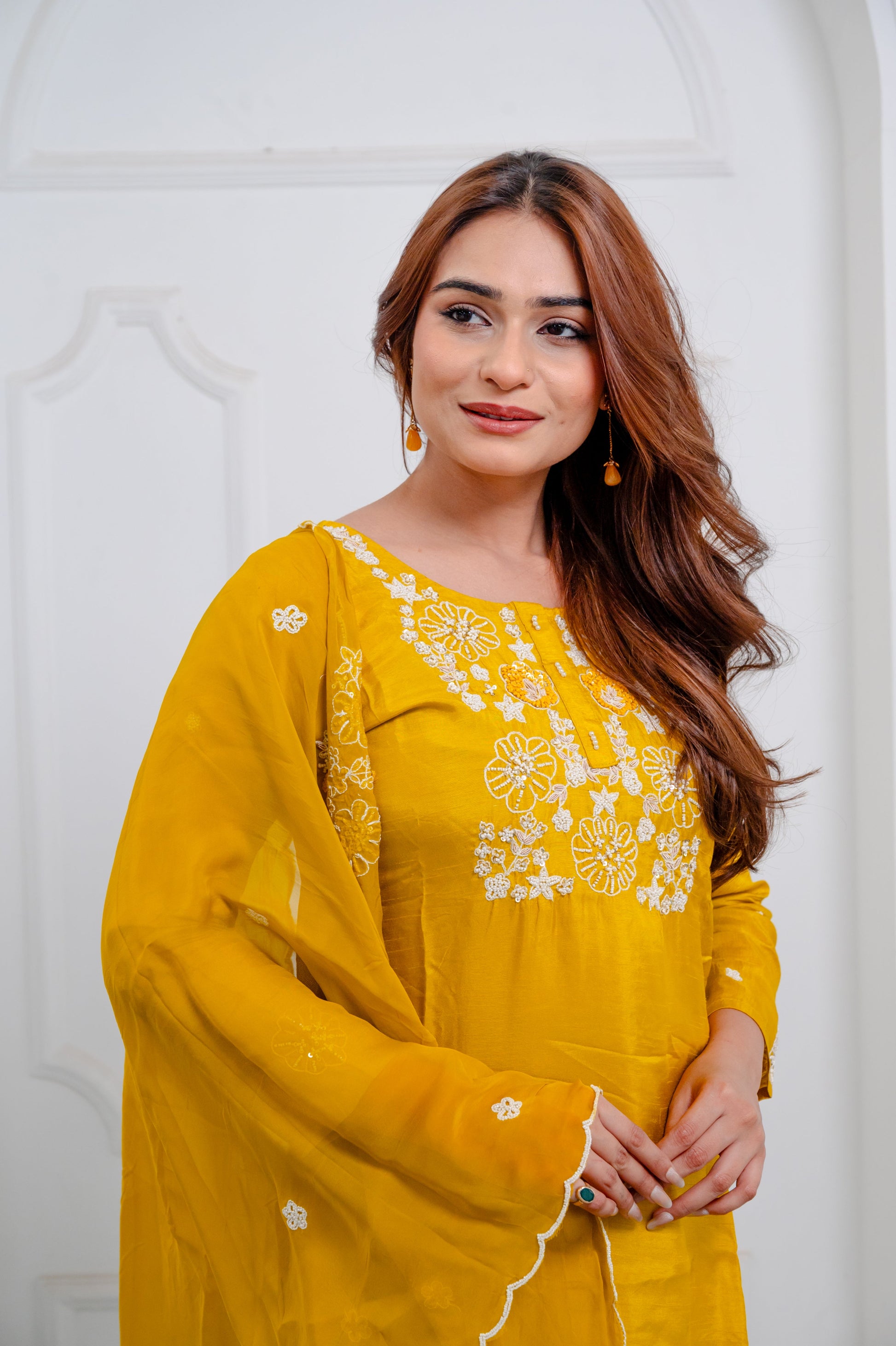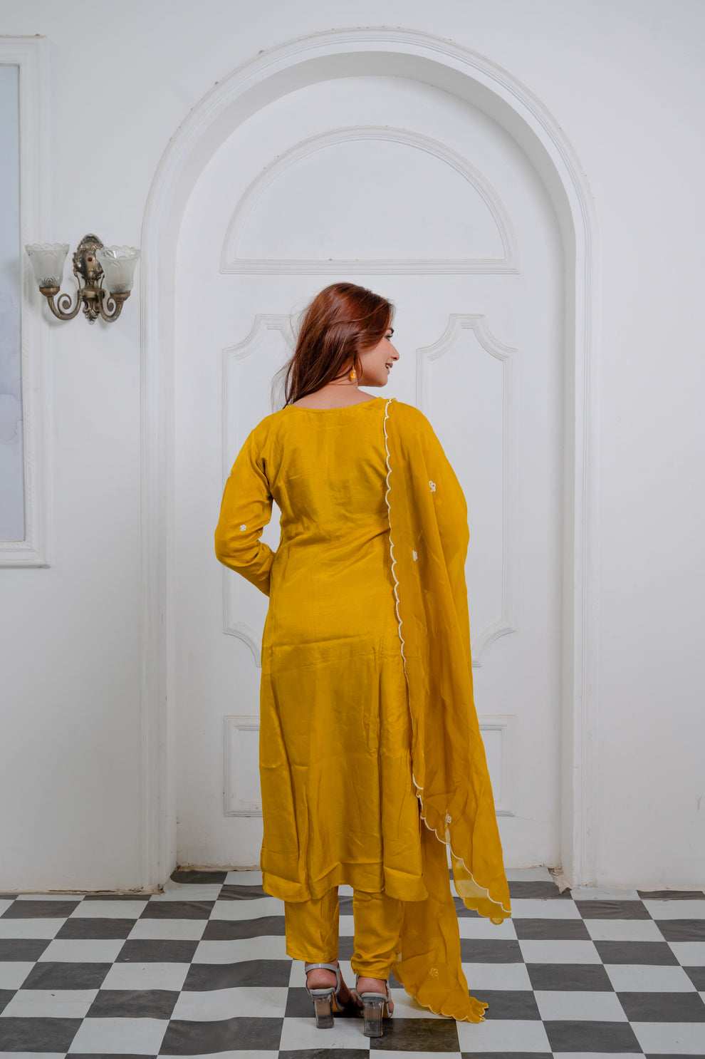 Mustard Yellow Dola Silk Suit Set with Organza Dupatta & Hand Embroidery