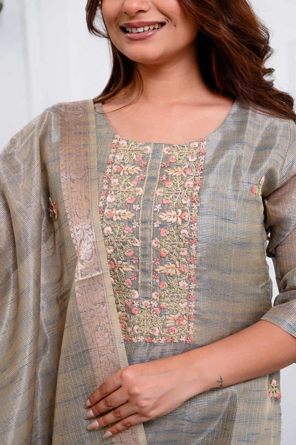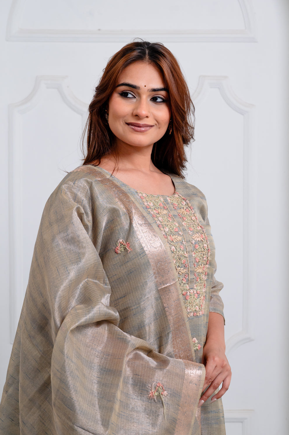 Bottle Green Suit Set with Golden Hues, Moti Work & Hand Embroidery