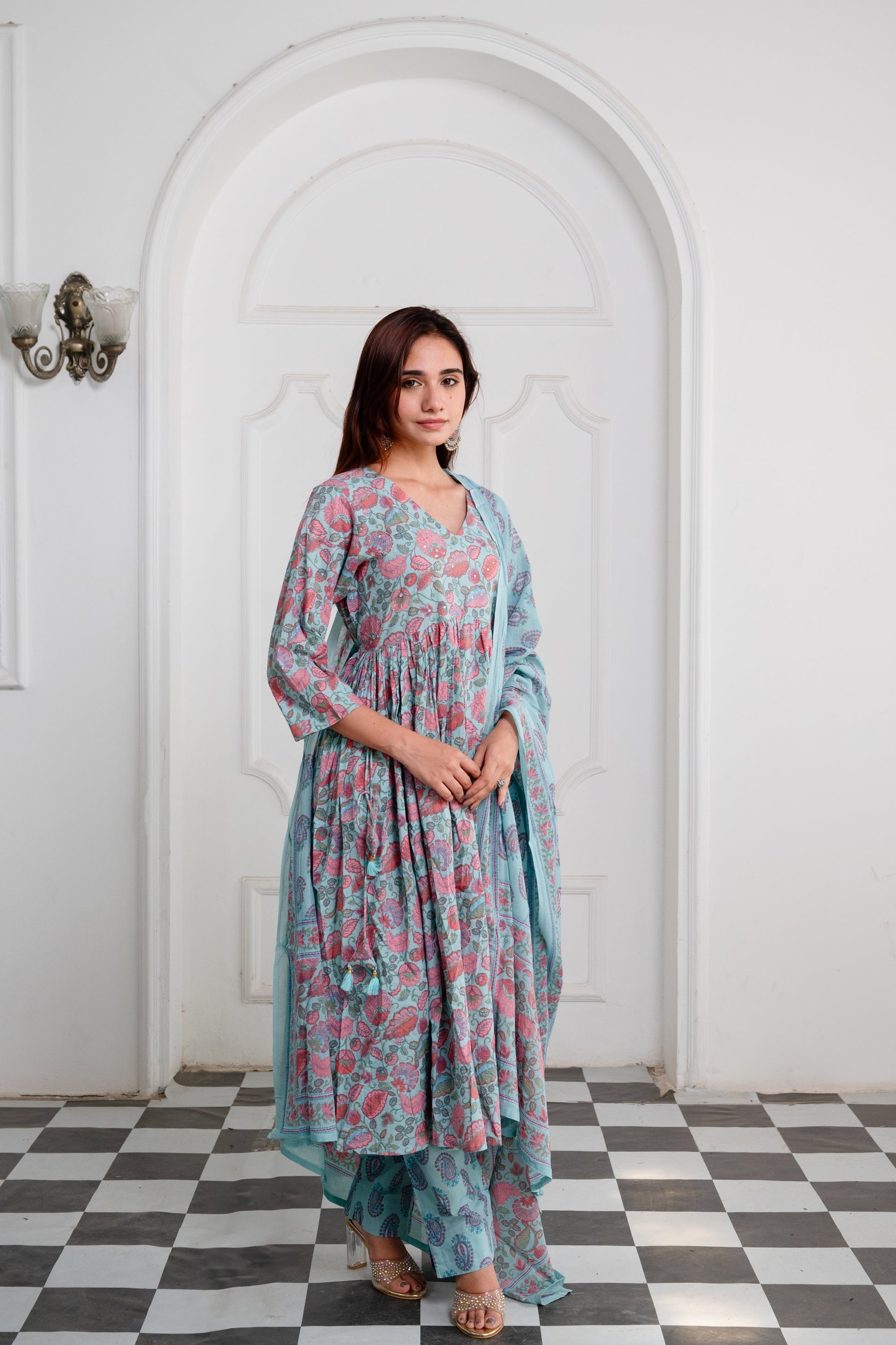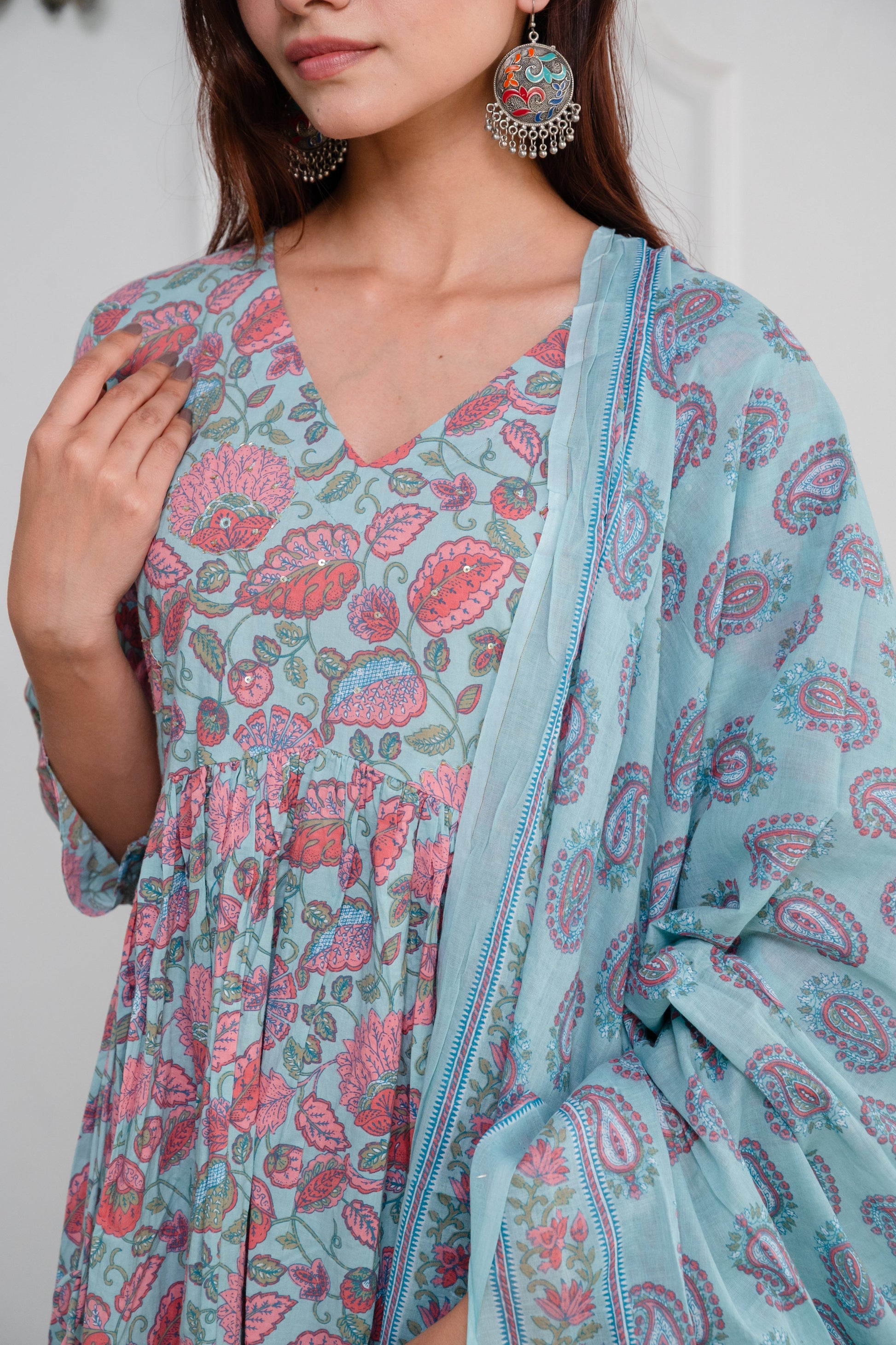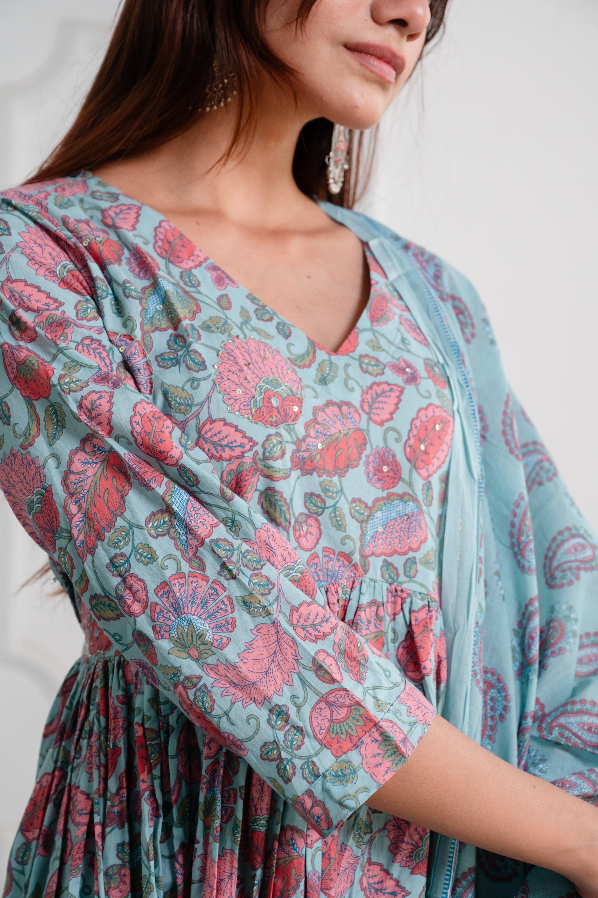 Dusty Ocean Blue Cotton Anarkali Suit Set with Sanganeri Handblock Floral Print