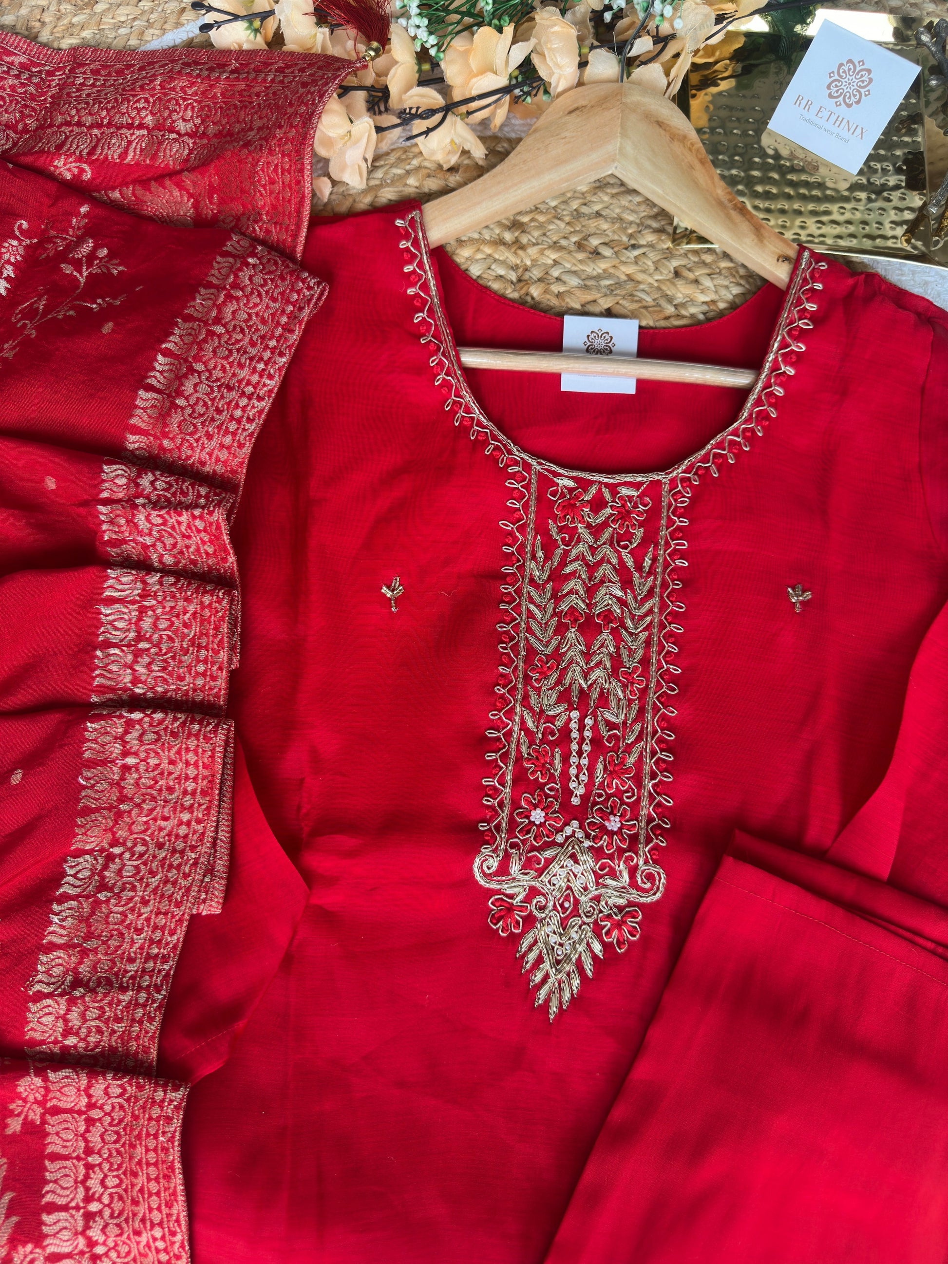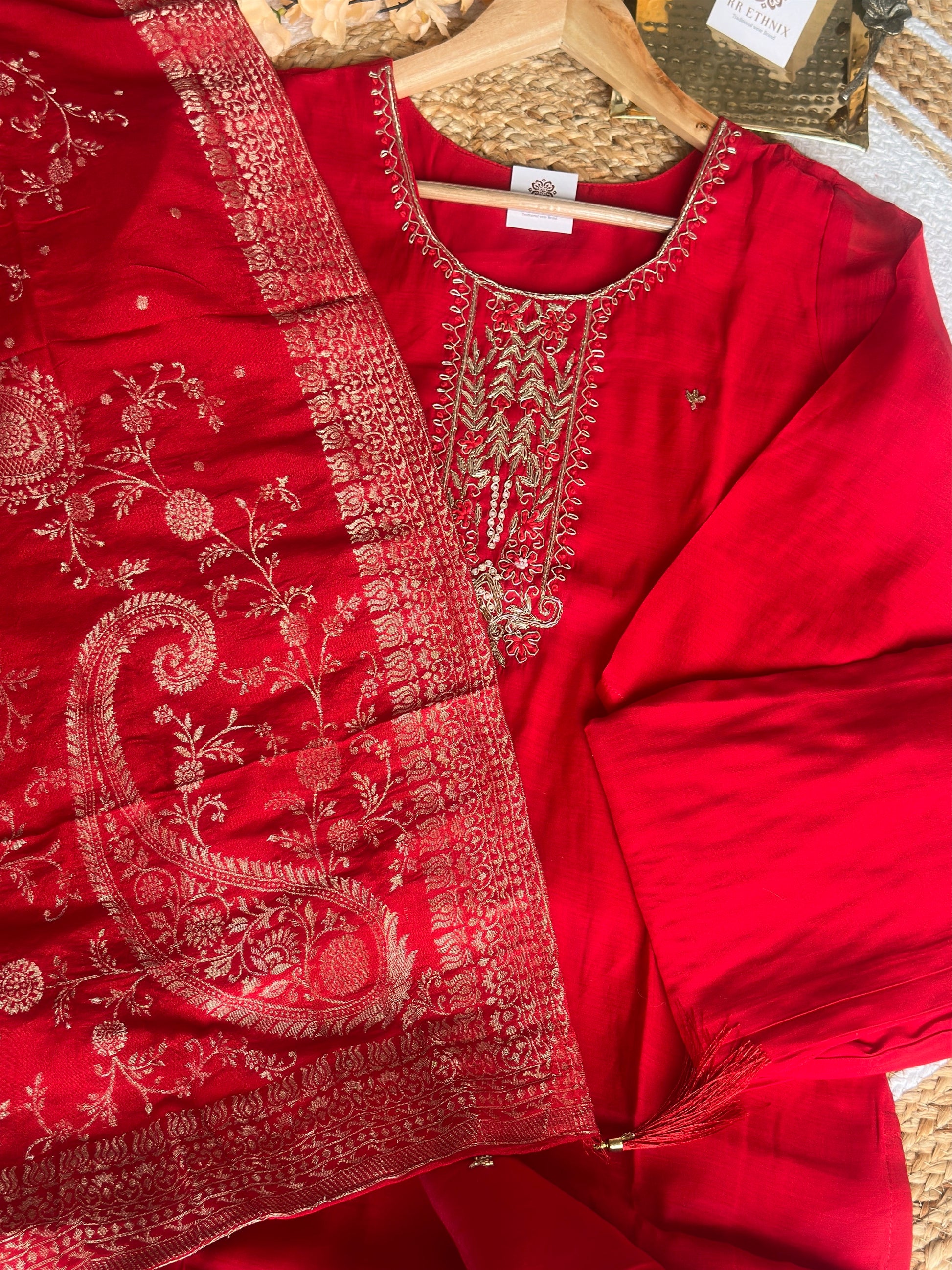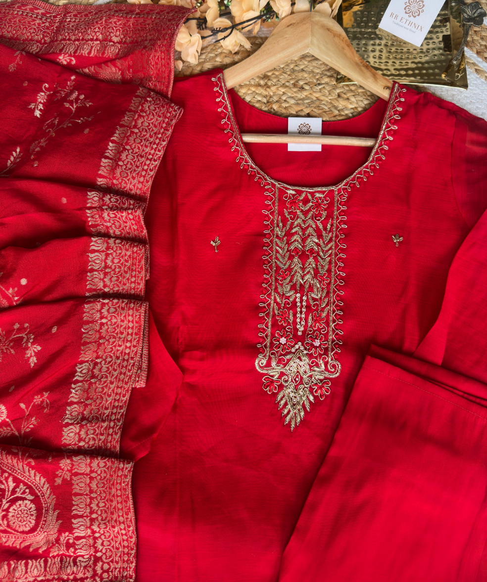Mul Chanderi Bright Red suit with Gold Zardosi Work and banarasi Dupatta