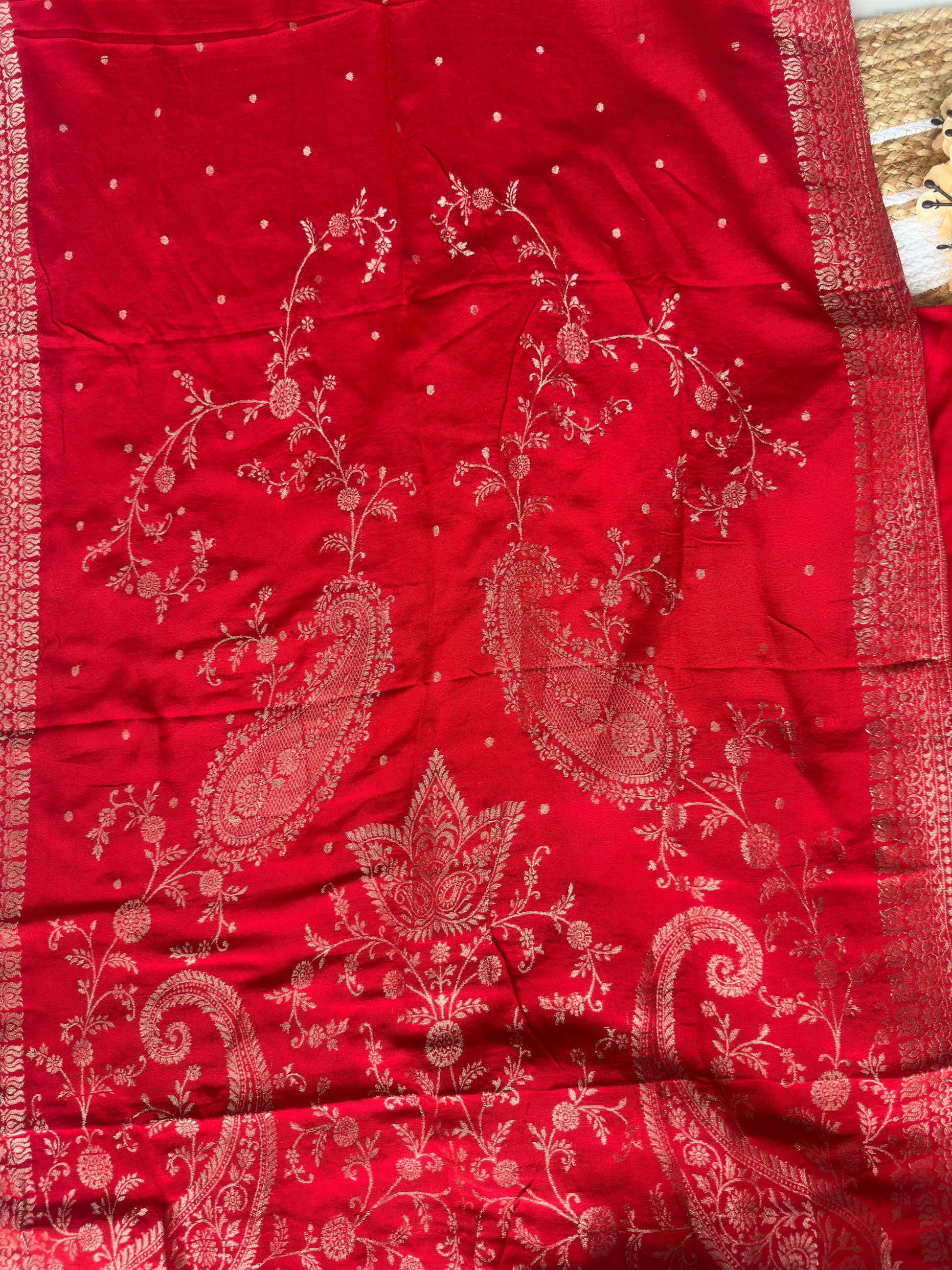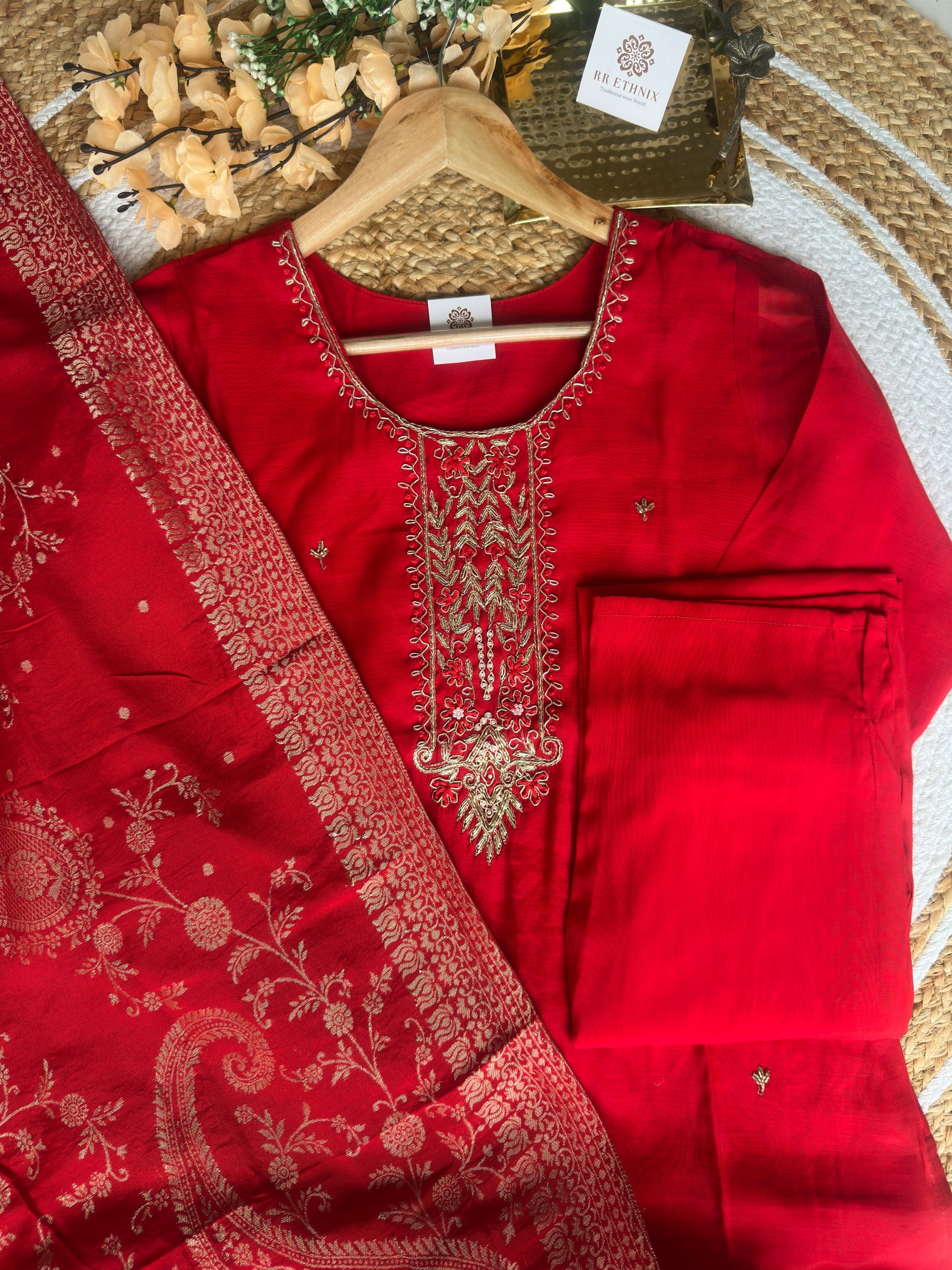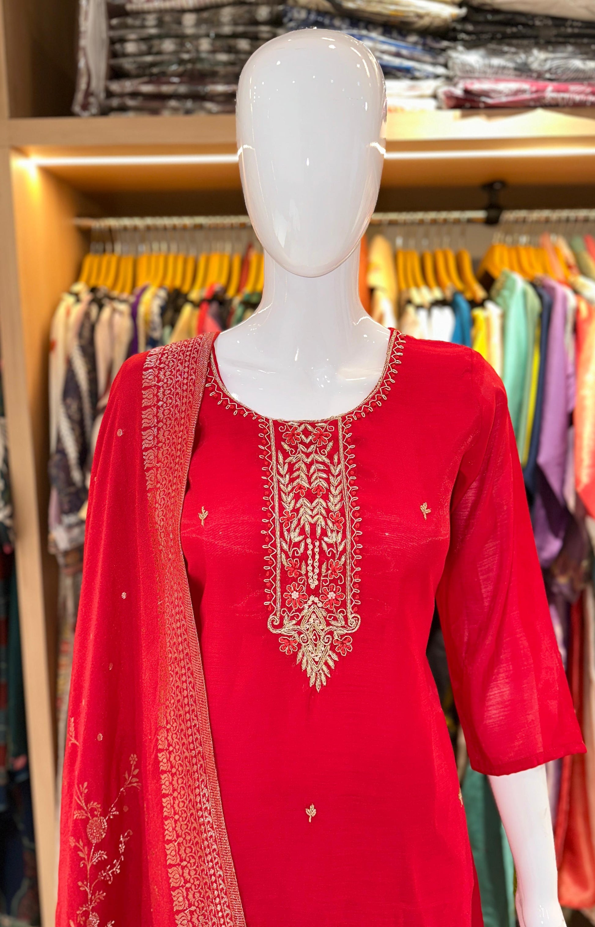 Mul Chanderi Bright Red suit with Gold Zardosi Work and banarasi Dupatta
