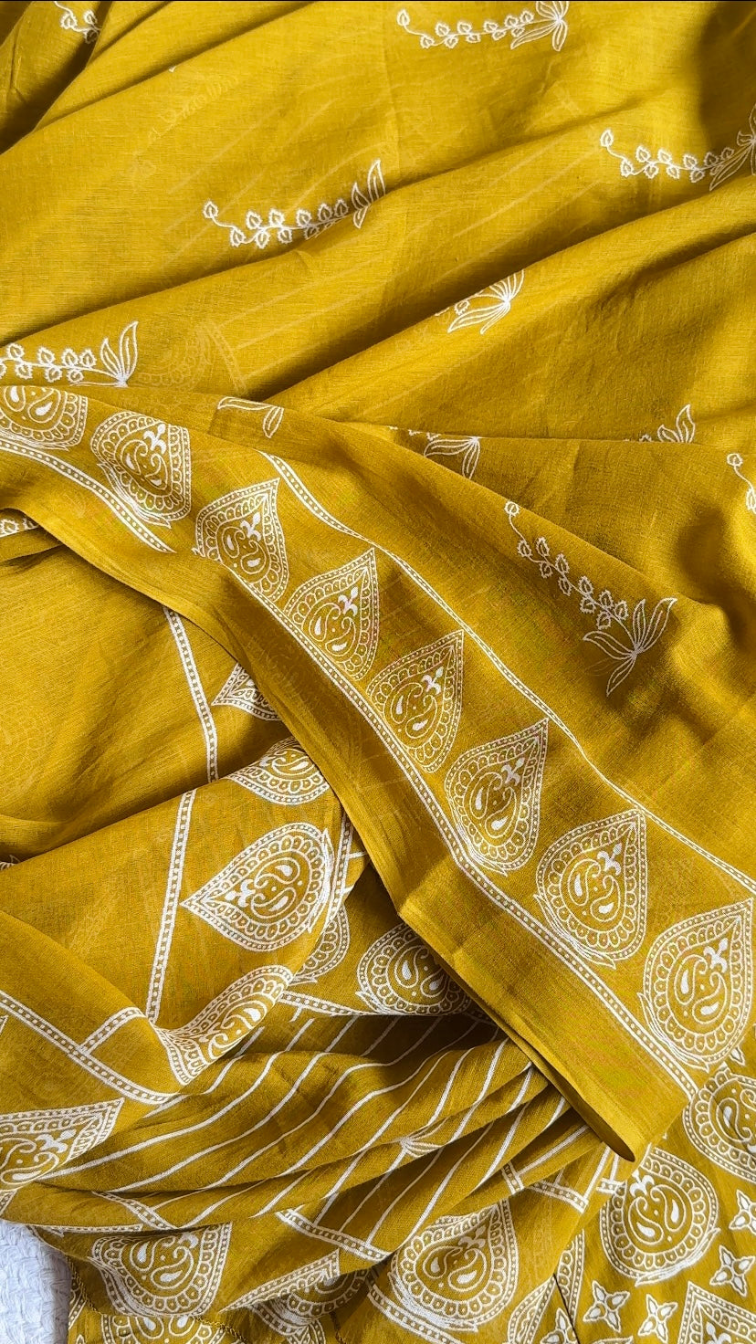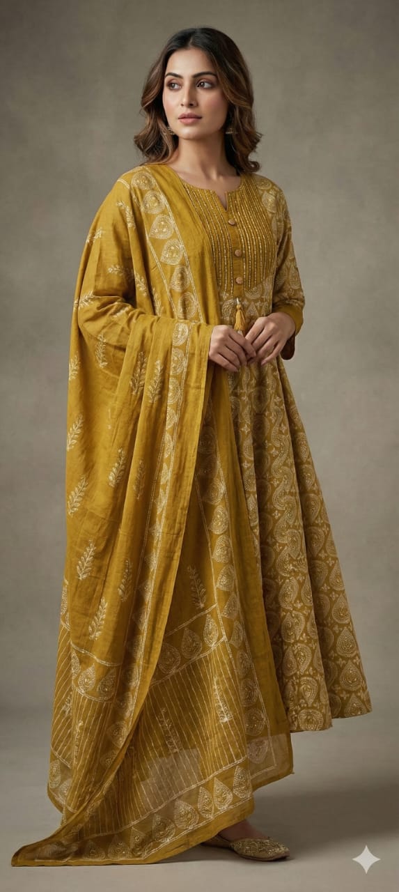 Mustard Yellow Printed Anarkali KurtaSet with Dupatta Pant Cotton wear