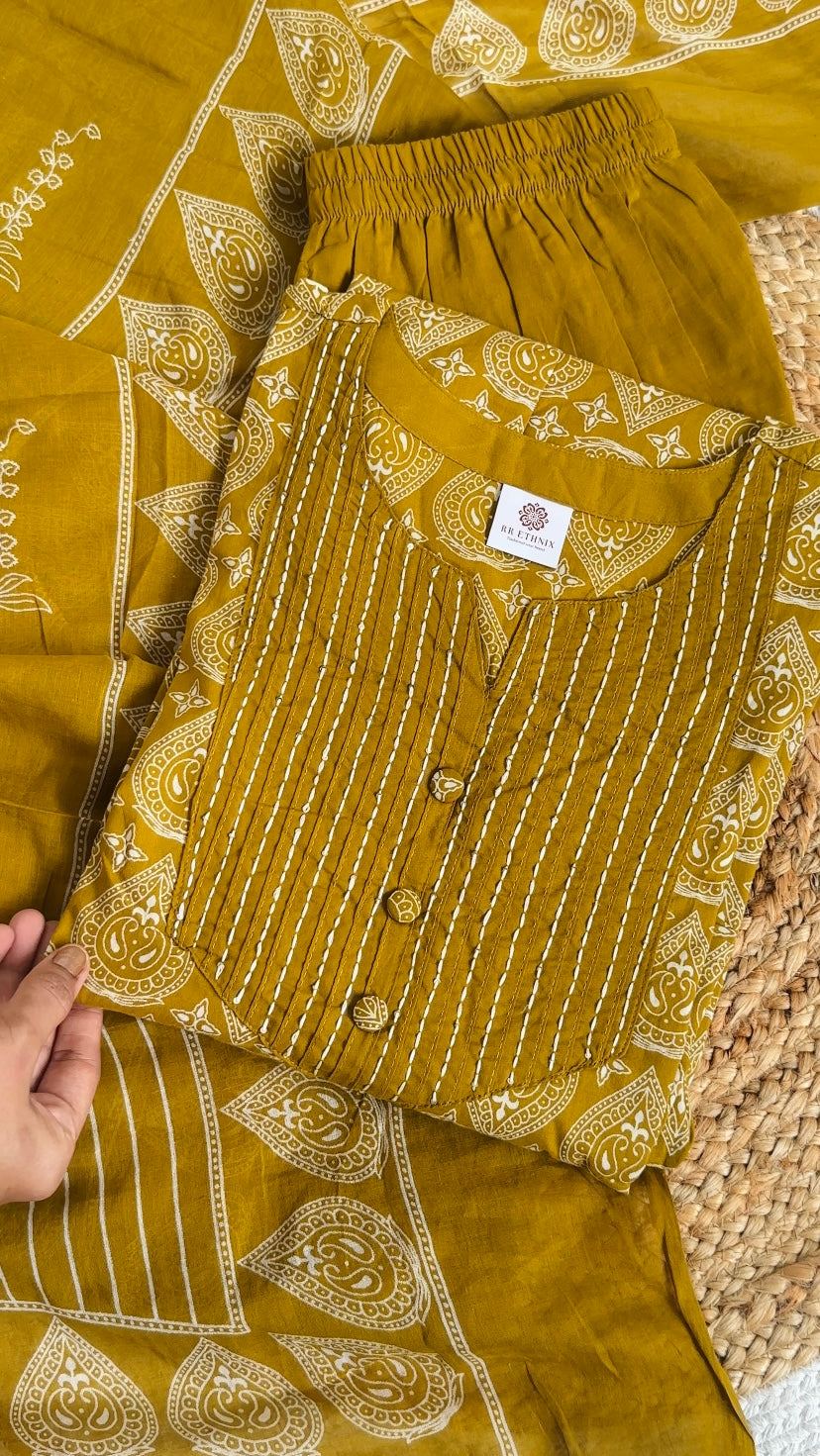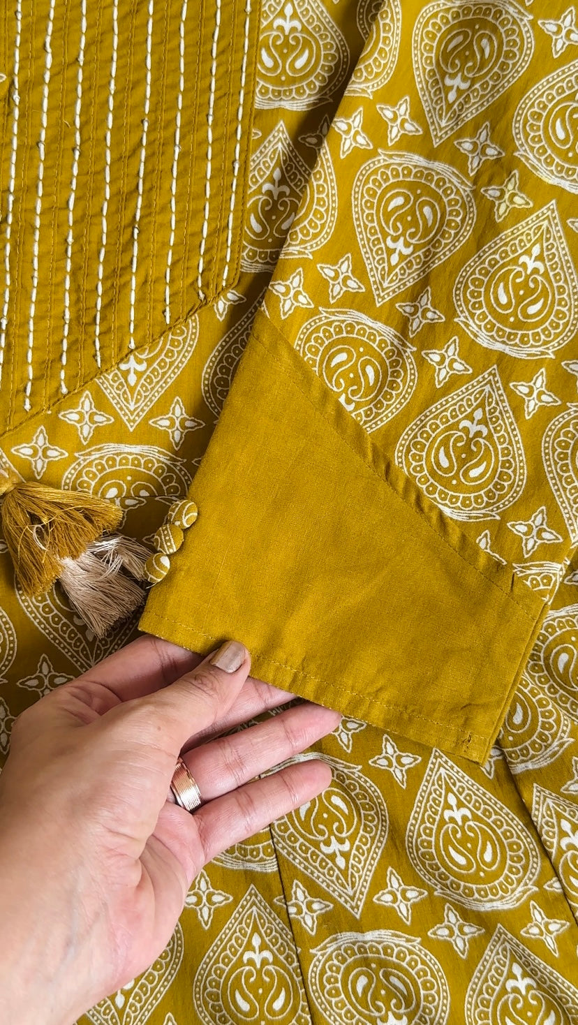 Mustard Yellow Printed Anarkali Kurta Set with Dupatta Pant – Cotton Ethnic Wear for Women