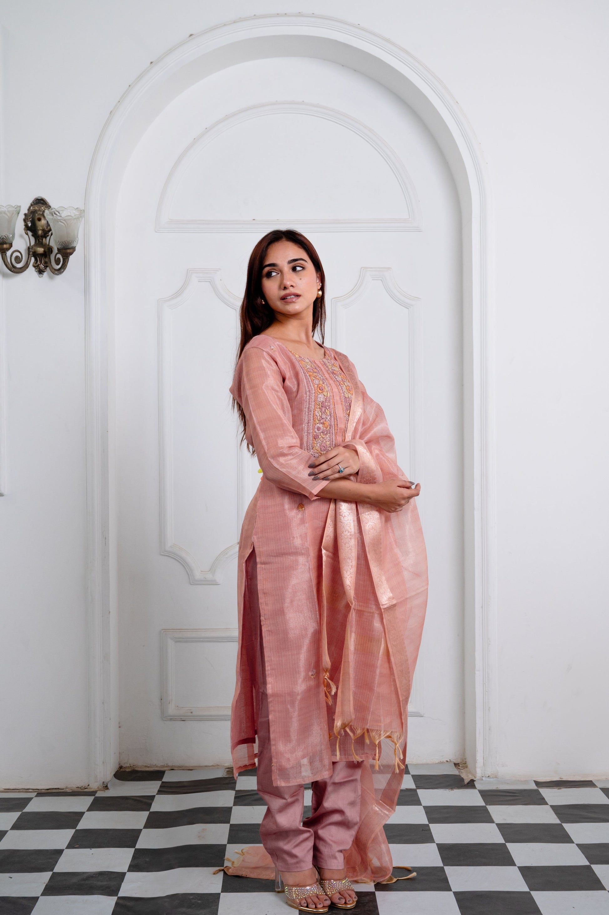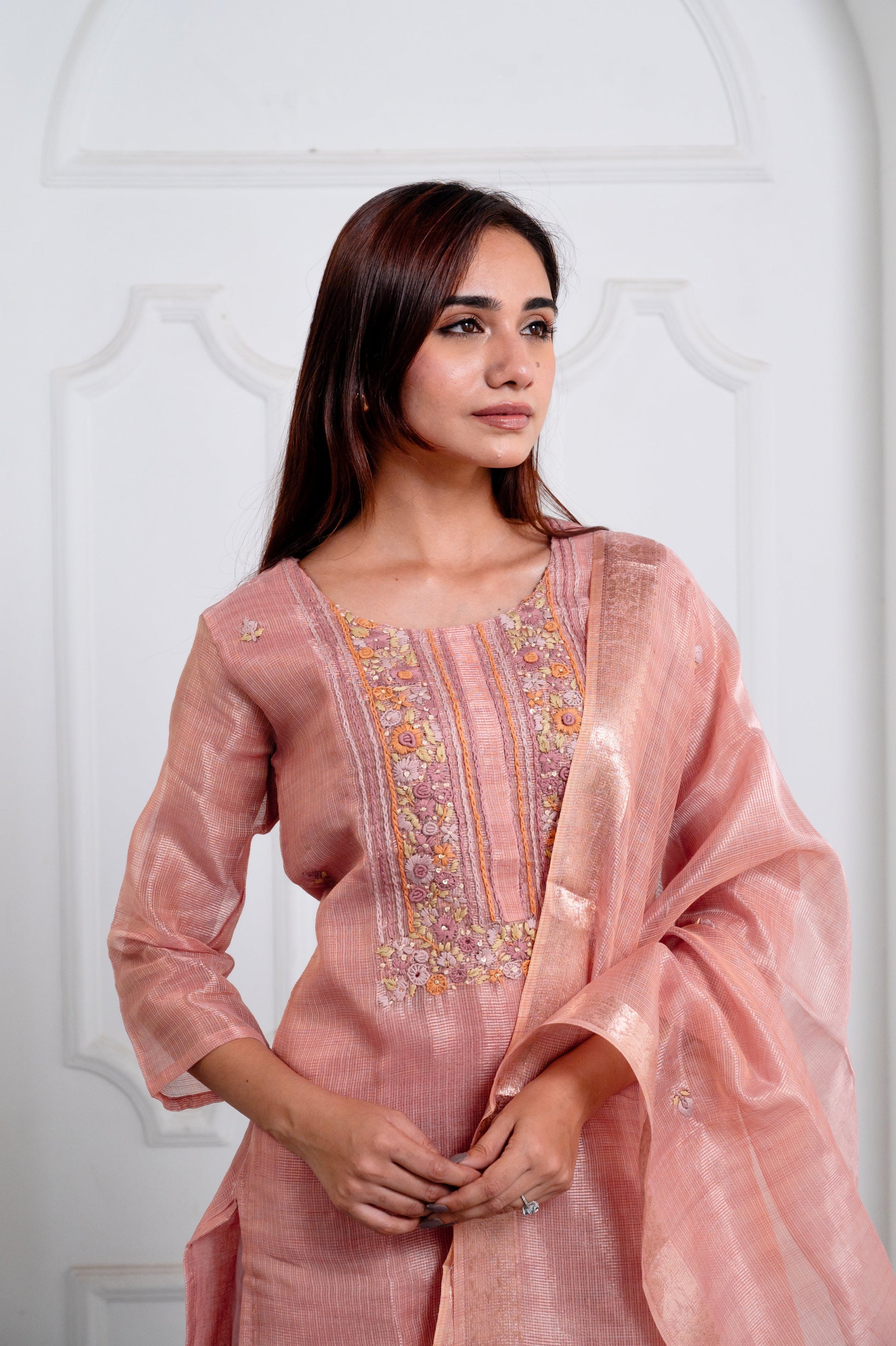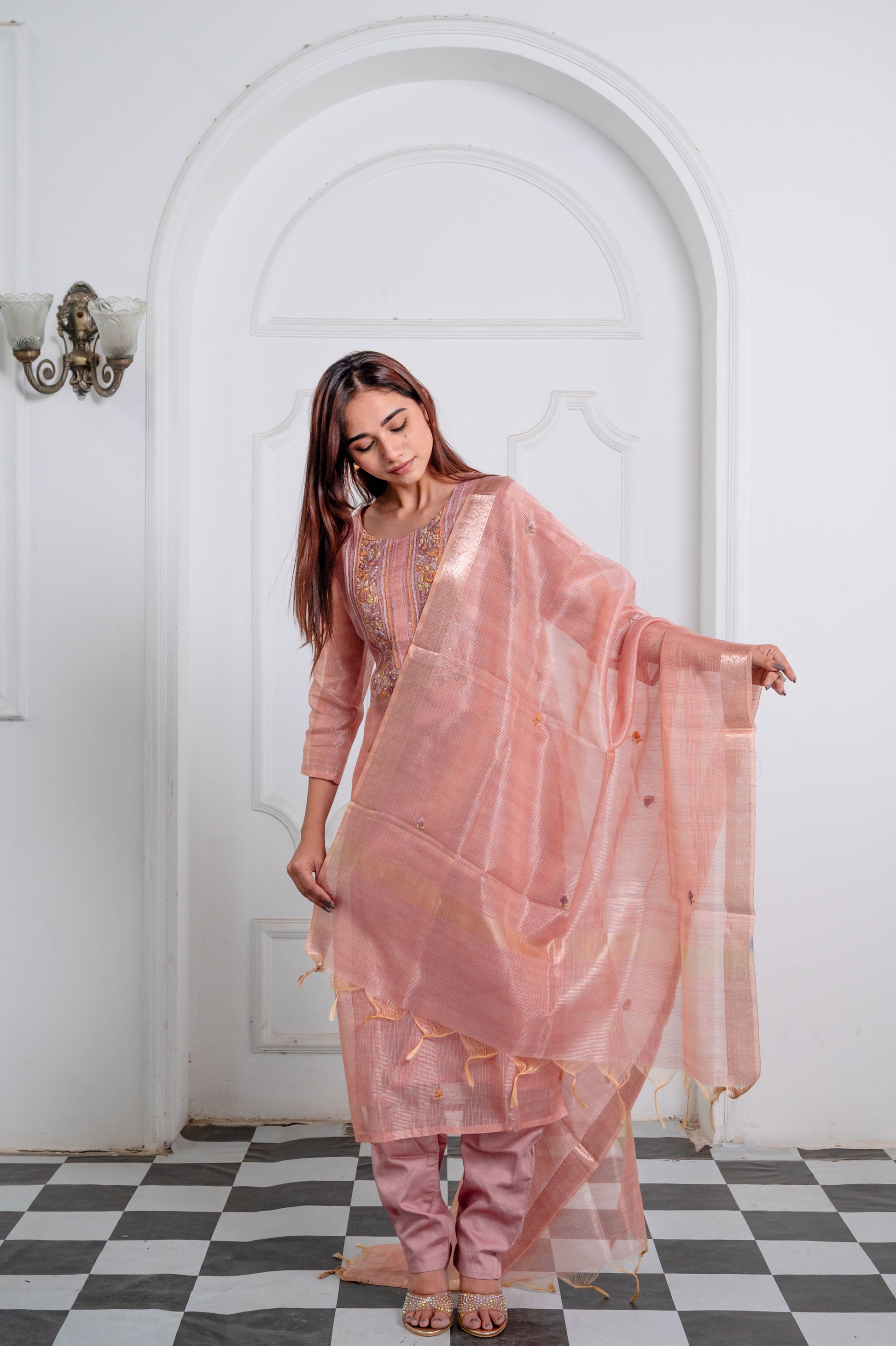Muted Coral Pink Embroidered Kota dori Suit Set
