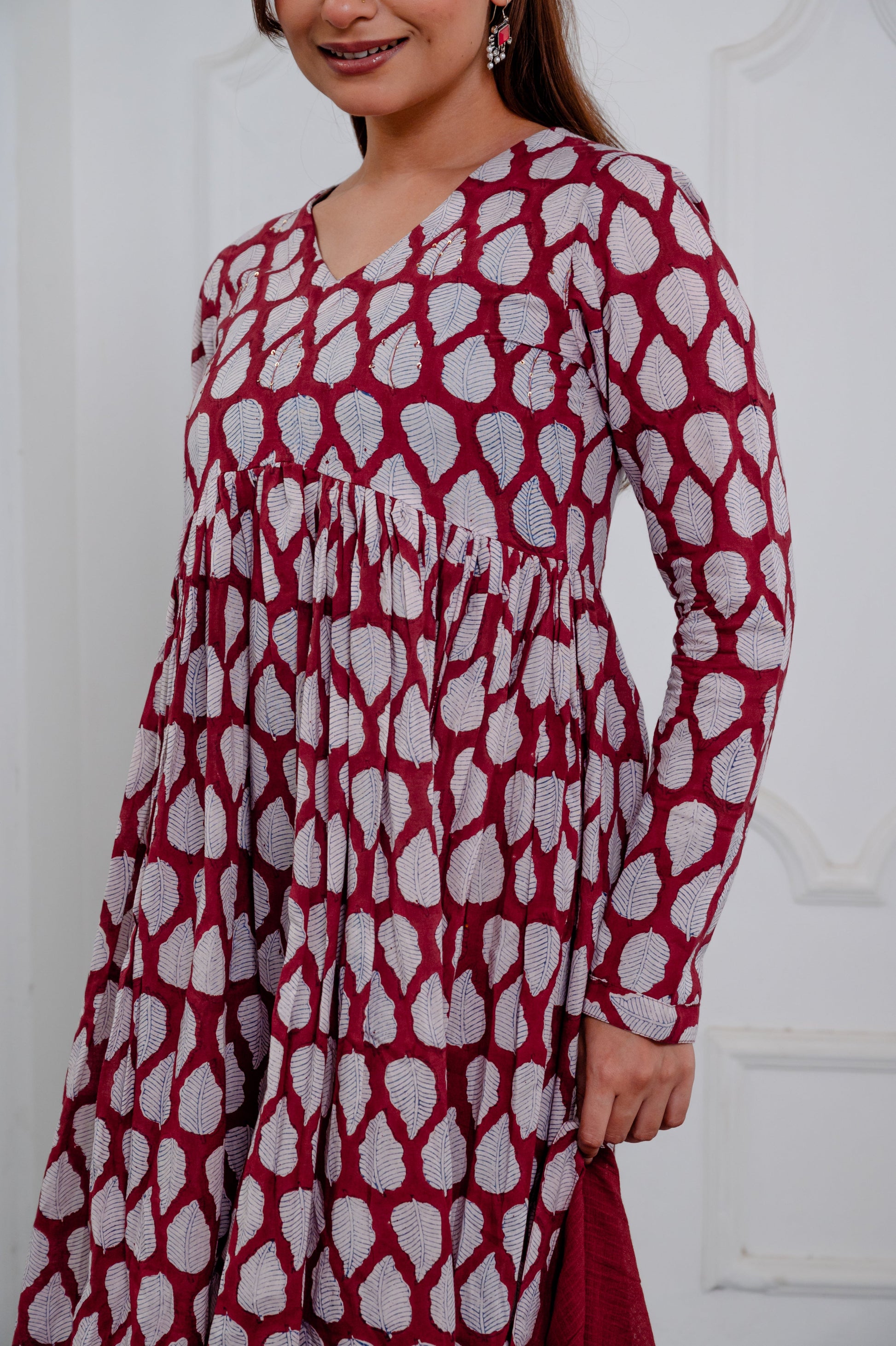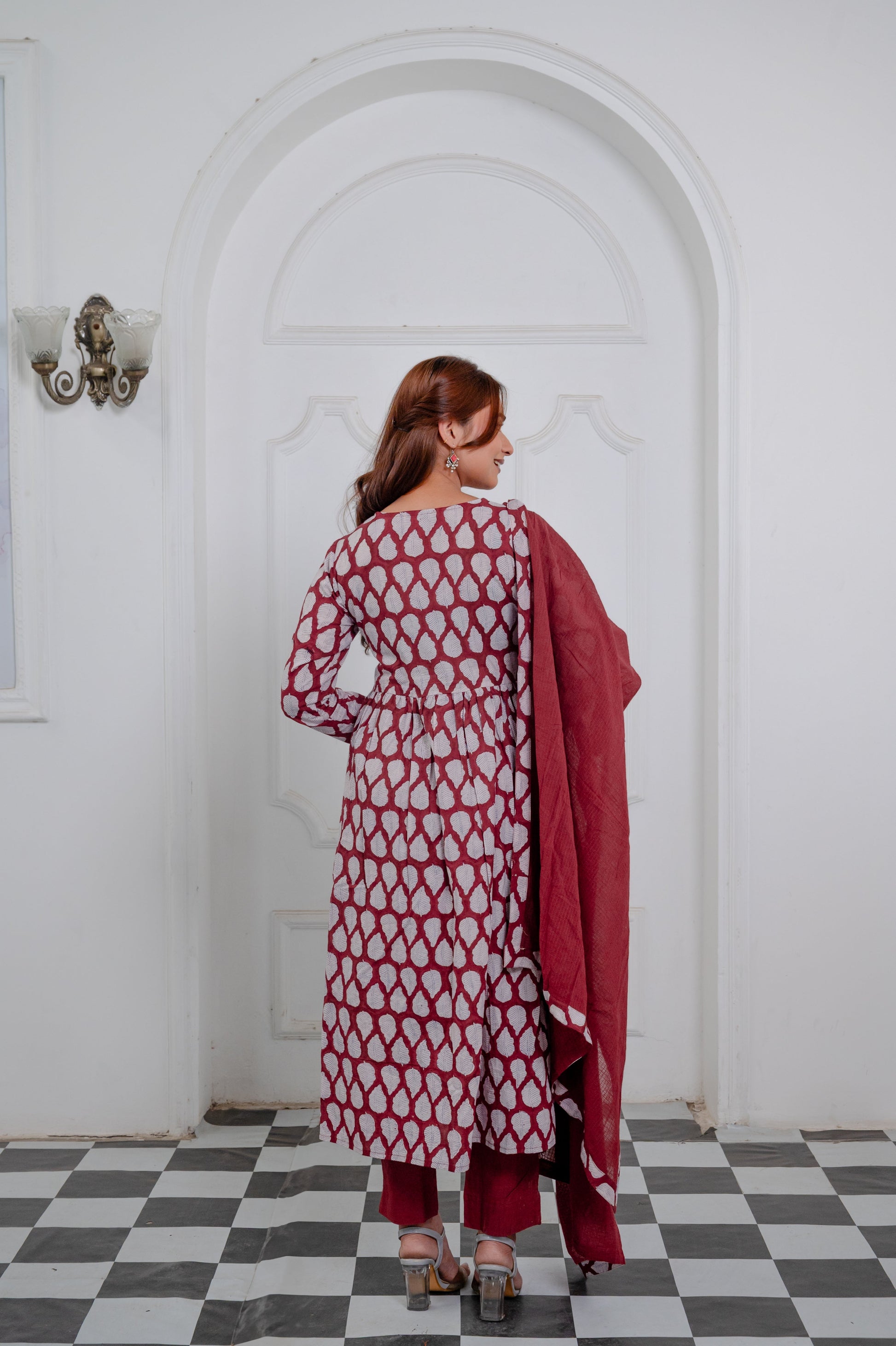 Ruby Maroon Hand-block Cotton Anarkali Suit Set with Sequin Accents