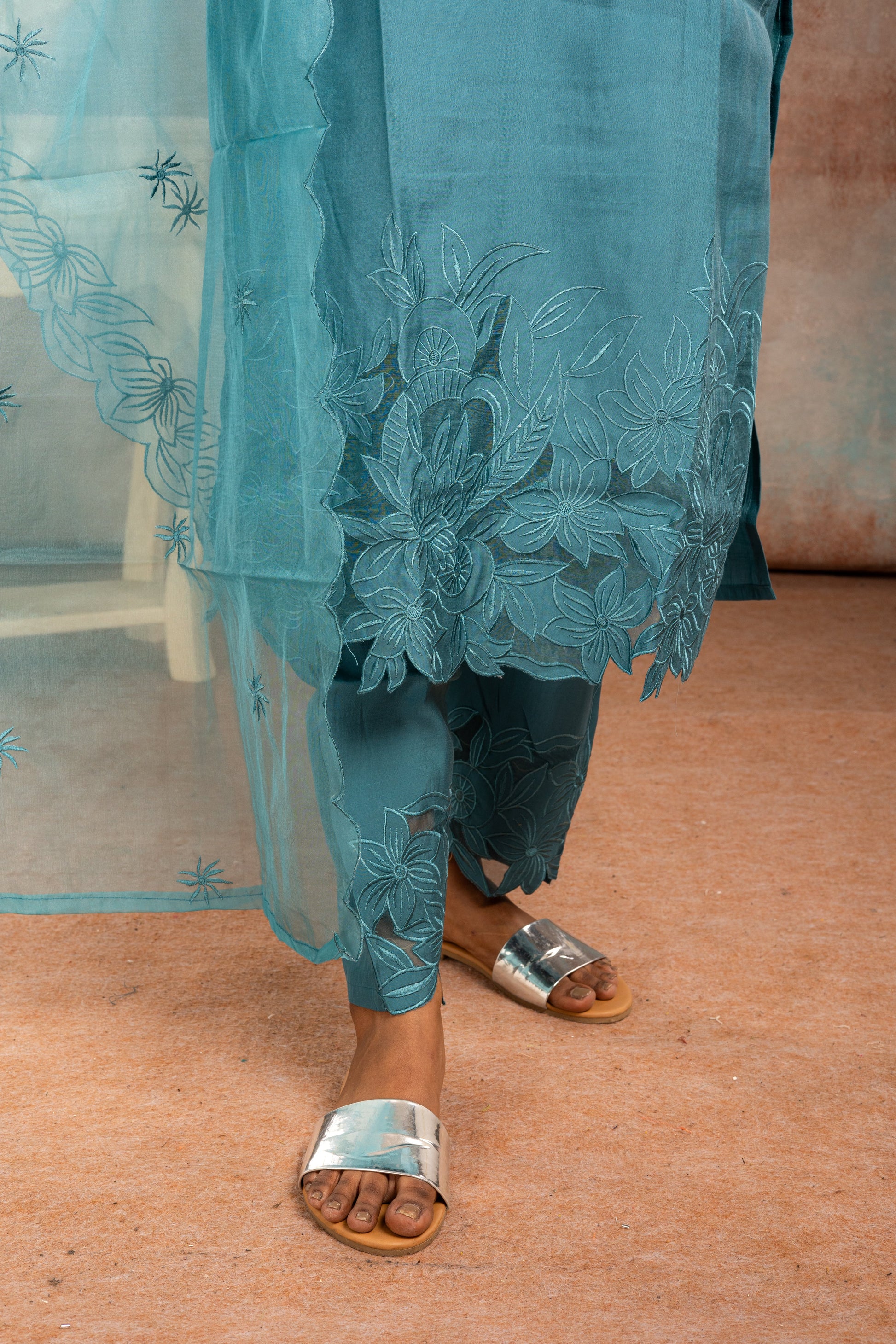 Teal Blue Muslin Salwar Suit Set with Embroidery